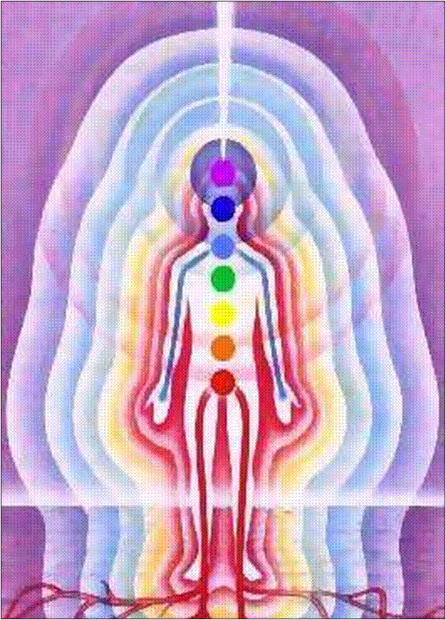 This energy body is an exact fit to our physical body. It extends several inches out from our skin and actually permeates our physical body. It is composed of etheric, super-etheric, sub-atomic (protons, neutrons, and electrons) and atomic matter. The sense organs of this body are the Chakras. The channels supplying the seven major Chakras are the Nadis: Sushumna (Centre-directly up the spine), Ida (left-feminine principle), and Pingala (right-masculine principle). The etheric body is an exact replica of the physical body, and shines clear and bright like full moon light in a healthy, well-adjusted individual.