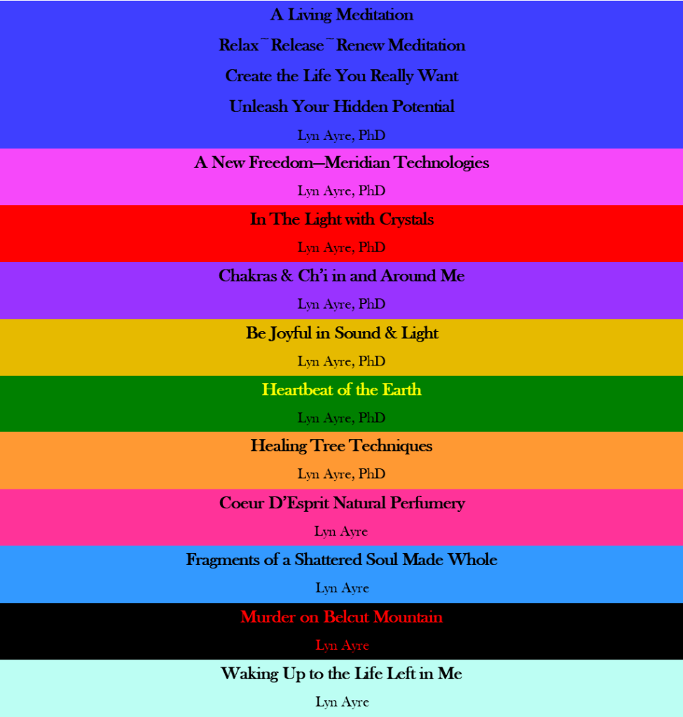All of these PDF books and meditation recordings are how I allayed the havoc wrought in my life through several crimes that were perpetrated against me. I not only survived, I have thrived. This is further to the solution part in my memoir, “Fragments of a Shattered Soul Made Whole”, here: https://lynayre.com/books-by-lyn/